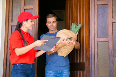 Pensive postwoman holding clipboard and showing data in order sheet. Attractive customer standing, receiving vegetables in paper bag from grocery store. Food delivery service and post concept
