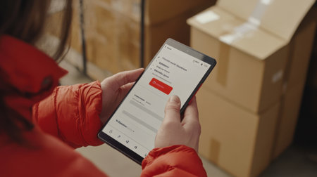 A person is using a tablet for inventory management in a warehouse environment. Stacked cardboard boxes serve as the background, emphasizing logistics and efficiency.
