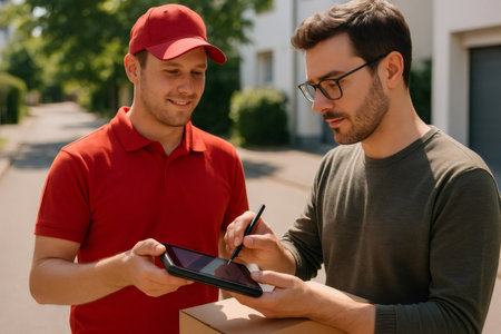 Delivery worker in a red uniform holds a tablet while a customer signs digitally. They are outdoors, showcasing modern delivery methods