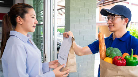 Asian deliver man in uniform handling bag of food vegetables and greens to customer at door home, food delivery concept