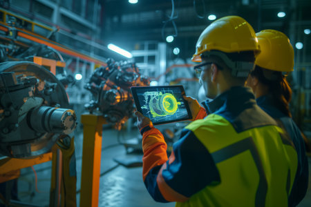 Engineer Worker quality control, maintenance, holding laptop Factory Warehouse Locations plant operators and engineers.