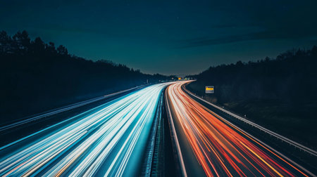Captivating night scene of a bustling highway with vibrant light trails from moving vehicles, demonstrating urban energy and the rhythm of city life.
