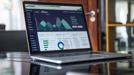 A laptop showing business analytics, charts, and performance metrics, symbolizing financial analysis, technology, and corporate decision-making in a modern environment.