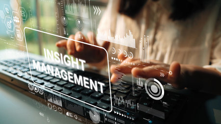 Hands Typing on Keyboard with Overlay Graphics Representing Data Management and Insight Analysis Concepts. Asymptotic smart data analytic.