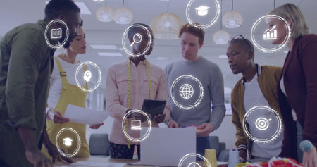 Image of network of connections with icons over diverse colleagues using tablet in office. Technology, business and digital interface concept digitally generated image.