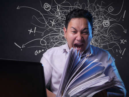 Portrait of angry depressed frustrated Asian businessman scream at the office for having stress overworked problems