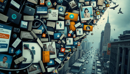 This image presents a dynamic composition featuring a cascade of digital elements flowing into a cityscape. Various digital icons and symbols are intricately intertwined, including recognizable brand logos and social media notifications. Close-up photos of people, text blocks, and digital interfaces dominate the left side, creating an overwhelming sense of digital presence. The scene transitions seamlessly into a bustling urban environment on the right, with an overcast sky and a prominent skyscraper in the background. Birds fly amidst the chaos, adding to the sense of movement and complexity. The overall mood contrasts the digital ages intensity with the citys everyday hustle.
