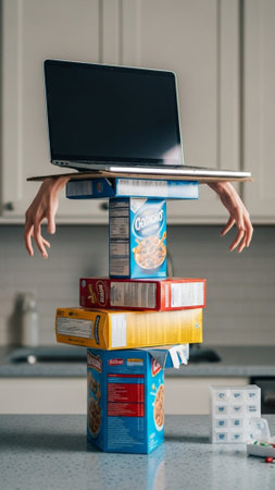 A man in a business attire sits at a desk and operates a laptop computer, Artistic interpretation of multitasking in a telework situation, AI Generated