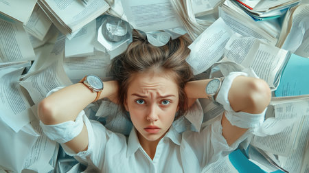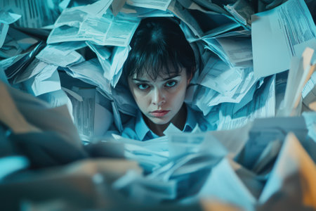 Stressed female office worker buried in disorganized documents at cluttered desk, symbolizing burnout, deadlines, and work pressure.