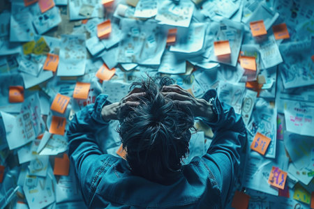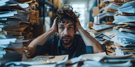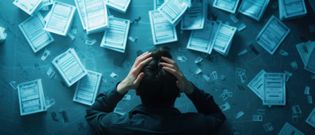 A man holds his head in frustration, surrounded by numerous documents and data sheets, symbolizing stress and information overload in a dimly lit office setting.
