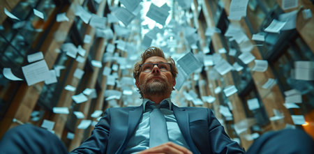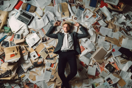 A top view of an overworked young Scandinavian businessman lying on the floor that is full of papers and documents in an office scene. Generative AI image AIG30.