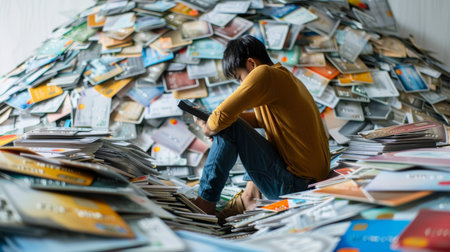 A solitary figure surrounded by overwhelming stacks of credit cards, engaged in financial calculations or planning.