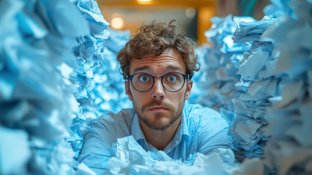 A young man sits in an office filled with crumpled paper looking bewildered and overwhelmed.