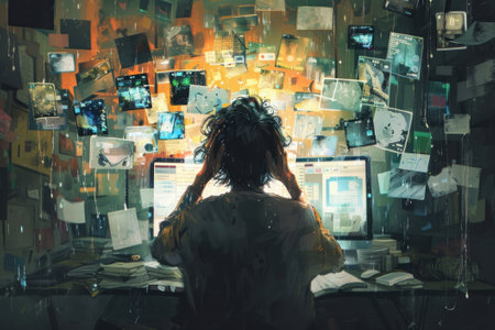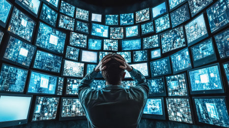 Overwhelmed by technology: person surrounded by multiple screens in a digital environment.