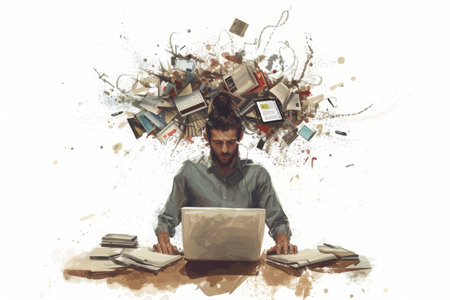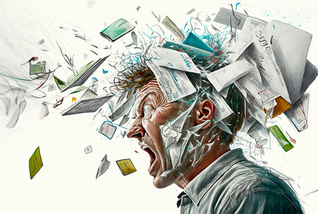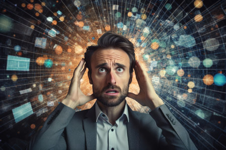 Business person overloaded by stress from business data and information that come from work, technology, social media and marketing business strategy received by a corporate employee
