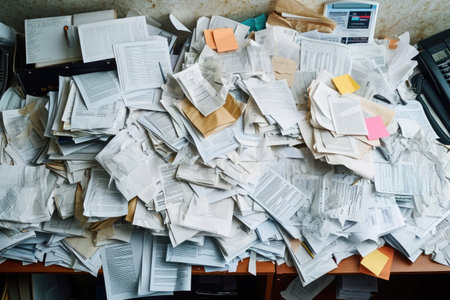 A stack of various papers arranged haphazardly on top of a sturdy wooden table, The chaos and order of an accounting office during the end of the fiscal year, AI Generated