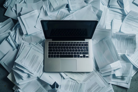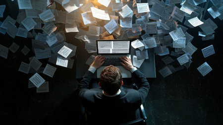A man is sitting at a desk with a laptop and a pile of papers. He is typing on the laptop and surrounded by the papers. Concept of productivity and focus