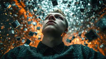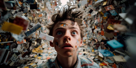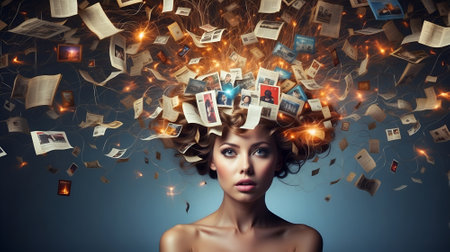 A Overwhelming information data explode out of head of young human brain, AI Generative