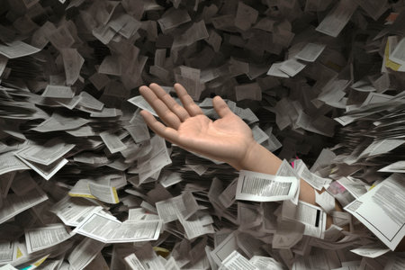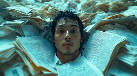 An exhausted man lies surrounded by a sea of paperwork, highlighting the overwhelming feeling of work overload in a disorganized environment.