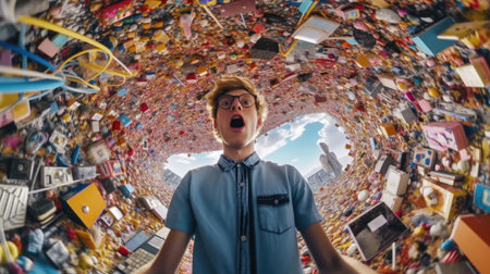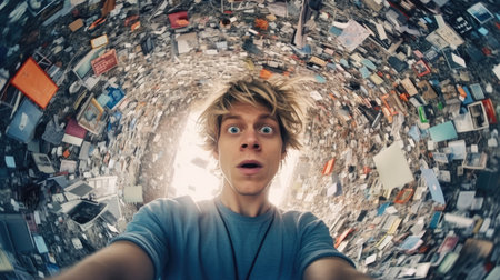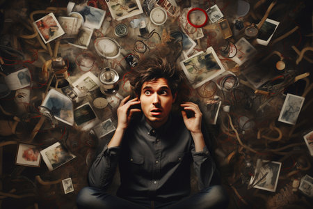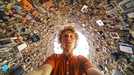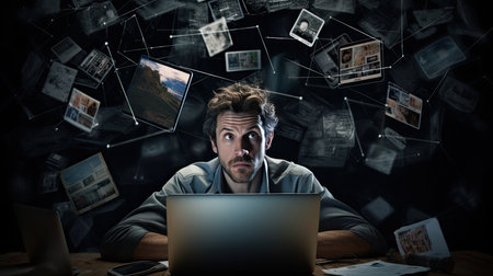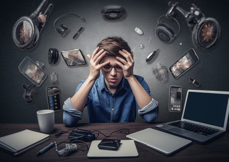 Young man overwhelmed with digital information overload surrounded by devices AI