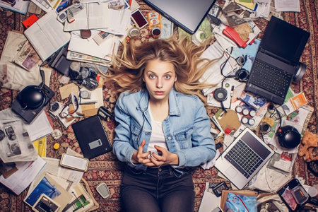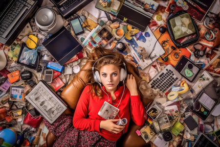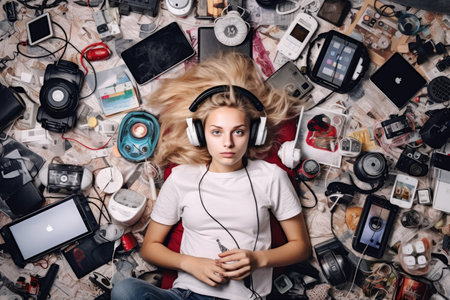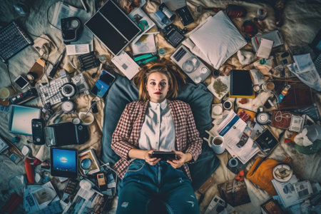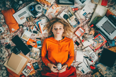 A top view of a Scandinavian teenage female lying on the floor with many electronic devices. Generative AI AIG30.