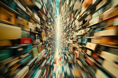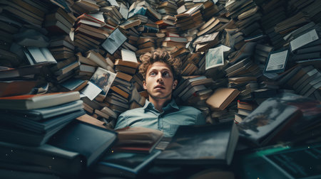 chaos drowning in data illustration knowledge struggle, books pages, scattered sea chaos drowning in data