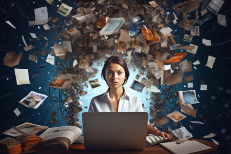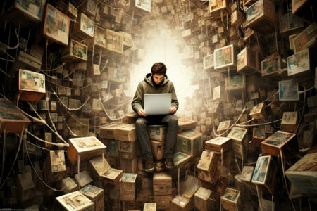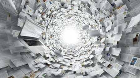 A laptop hovers in a vortex of swirling papers and documents, symbolizing the explosion of information in modern times. The bright center represents clarity amidst chaos.