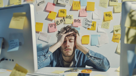 Stressed worker, surrounded by colorful sticky notes, struggles with multitasking and time management at their computer. The scene captures the chaos and pressure of meeting deadlines