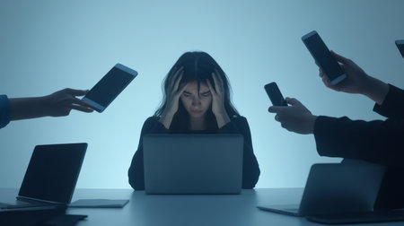 Stressed individual surrounded by electronic devices and hands holding phones, symbolizing the chaos of multitasking and tight deadlines in a modern work environment