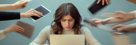 Stressed office worker surrounded by hands holding digital devices, symbolizing multitasking and time management challenges. The scene conveys chaos and pressure in a work environment
