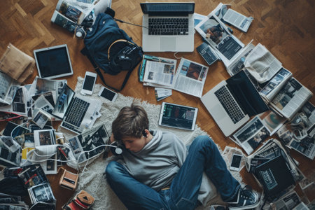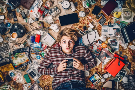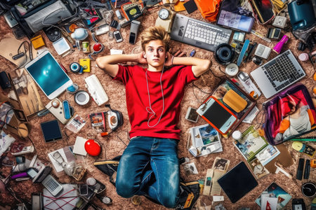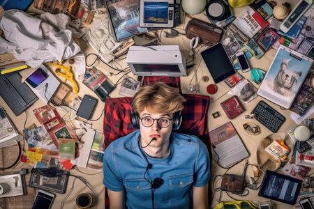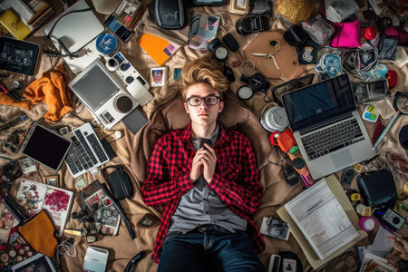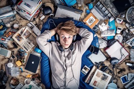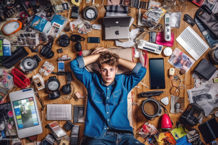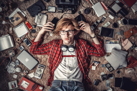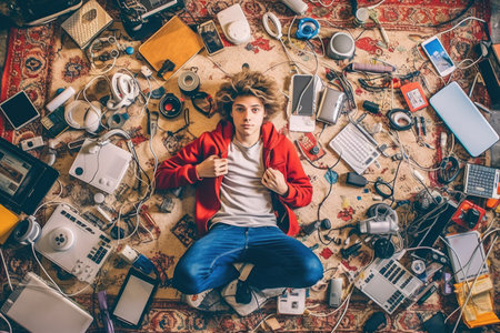 A top view of a Scandinavian teenage male lying on the floor with many electronic devices. Generative AI AIG30.