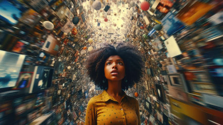 A person stands with their back turned, immersed in a vibrant display of diverse imagery, visualizing thoughts and ideas during a brainstorming process.