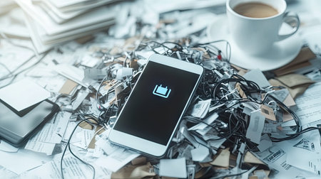 Mobile phone with a low battery icon displayed, lying on a cluttered desk with scattered papers, coffee cup, and tangled charger in the background.