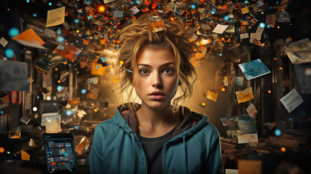 Portrait of a beautiful young woman with flying books and information data explode in her head.