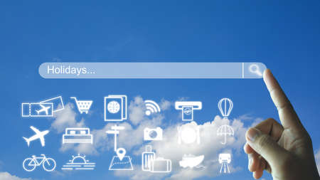 Hands are pressing searching for attractions and vacations and making reservations for plane tickets, cars, shopping for restaurants, hotels in a sky background. holiday and vacation concept.