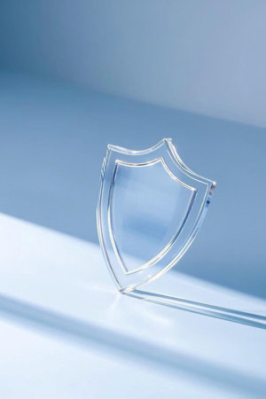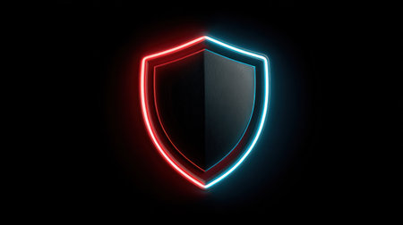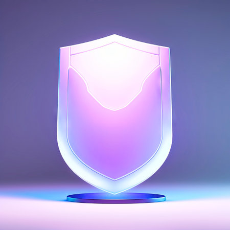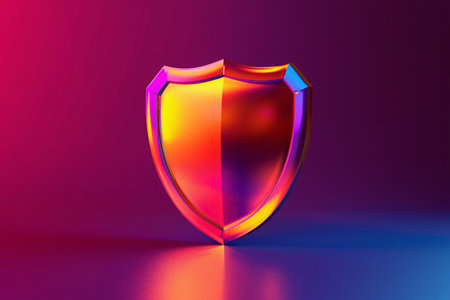 Glowing shield illustration on a reflective surface, representing security and protection, with neon edges creating a modern and dynamic atmosphere
