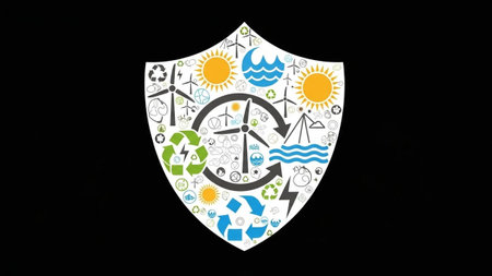 A shield-shaped graphic filled with various symbols representing renewable energy sources and environmental sustainability.