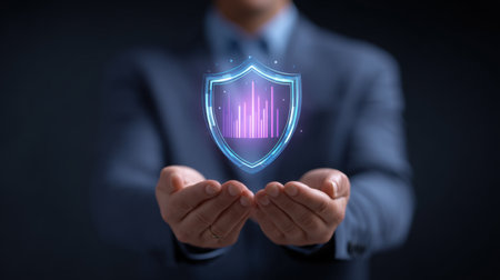 A businessman showcases a digital shield icon representing cybersecurity. The futuristic design emphasizes data protection and online safety in a modern context.