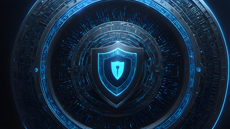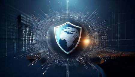 This striking image showcases a digital shield representation, embodying concepts of cybersecurity and protection against threats in a vibrant technology-themed background.