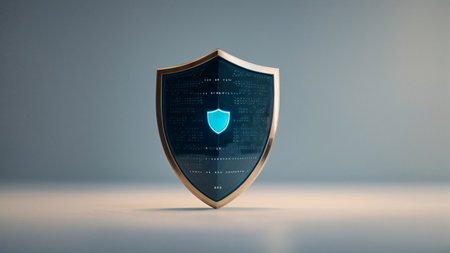 A glowing cybersecurity shield on textured surface symbolizes protection