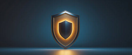 A glowing black shield with a yellow border sits on a black surface. The shield is surrounded by a glowing, metallic frame. Concept of security and protection