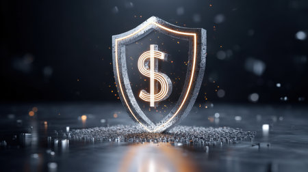 This striking digital image features a shield embedded with a dollar sign, representing finance security, protection of wealth, and modern investment concepts.