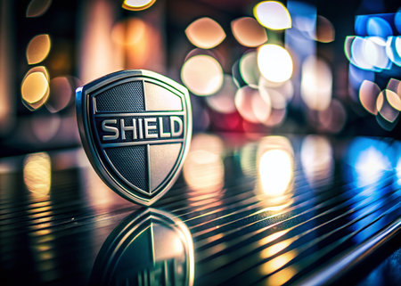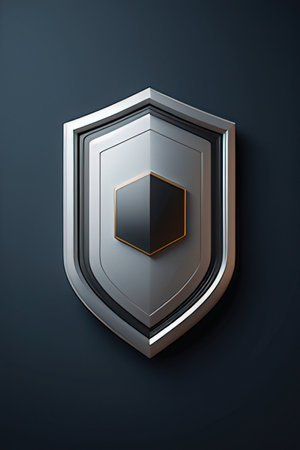 A metallic shield with water droplets sits against a blurred background, symbolizing strength, protection, and resilience. the droplets add texture and depth, enhancing the theme of steadfast security. Generative AI