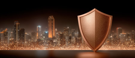 Shield protecting urban skyline cybersecurity concept glowing particles night city