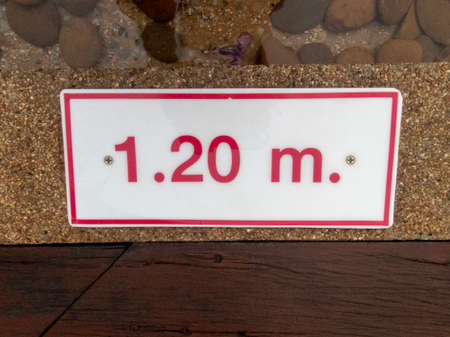 Red and white 1.20 meter depth water sign on the ground beside swimming pool