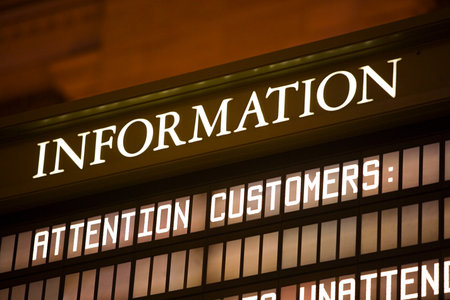 Information neon label over infopoint desk, and hanging toilets and lifts pictogram at airport hall.