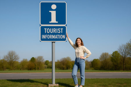 Tourist happily posing beside a large blue and white information sign on a bright, sunny day, enjoying an adventurous journey outdoors