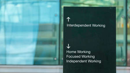 Interdependent Working terms used on a city-center sign in front of a modern office building