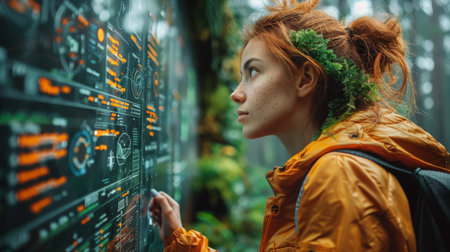 A woman using eco-future technologies in the eco-system. Working in an ecological environment.