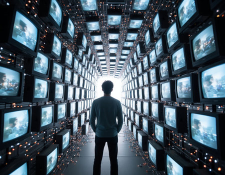 Man looking at multiple television screens in a dark room. 3d rendering